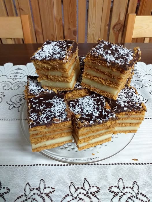 Tradycyjnie ciasto składa się z 3 placków przełożonych masą.